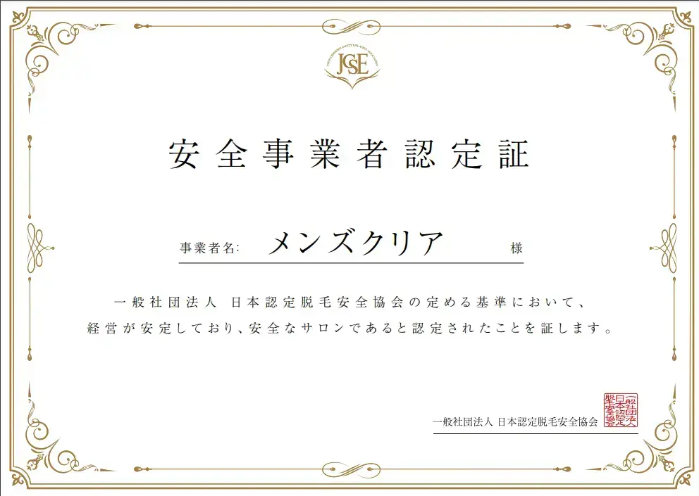 ※一般社団法人日本認定脱毛安全協会より「安全事業者認定」を取得 取得日25年1月
